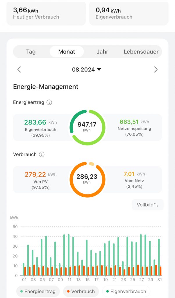 - PV-Anlage 7 kWp mit 5 KW Speicher für ein optimales Energie-Management (Nachfolgend ein reales Beispiel aus August 2024)